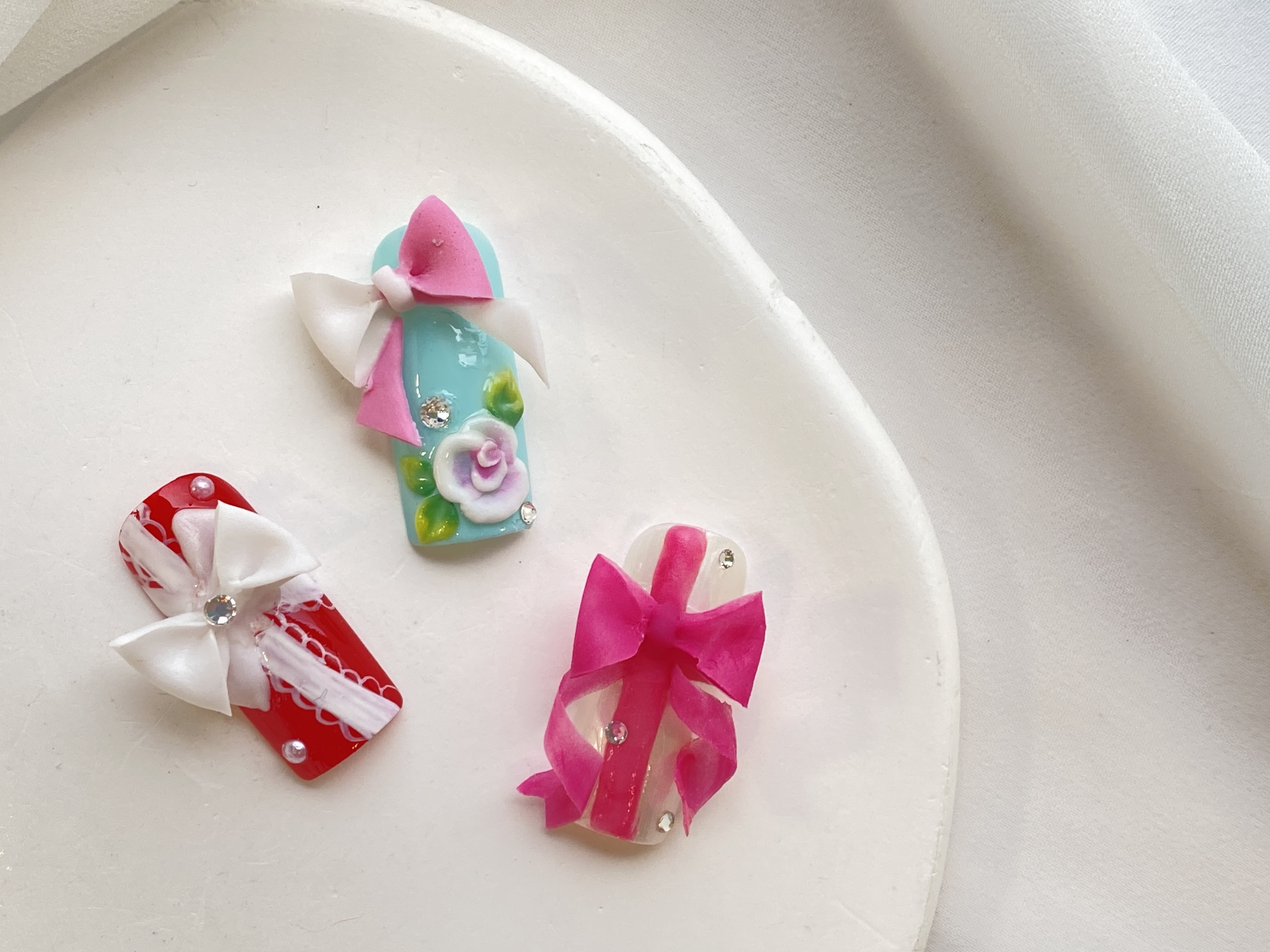アクリルでパーツを作り、爪の上にのせて仕上げる方法。しっかりとした立体感を出せます。